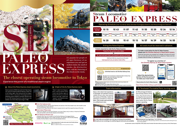 팔레오 익스프레스는 도쿄와 가장 가까운 곳에서 이용할 수 있는 증기 기관차입니다. 선로 위를 달리는 증기 기관차의 연기 냄새와 경적, 덜컹거리는 흔들림 등, 현대식 전동 열차에서는 경험할 수 없는 낭만으로 많은 인기를 누리고 있습니다.