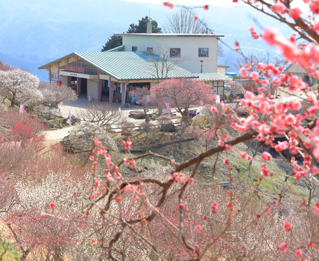 宝登山ロープウェイ山頂駅前にある梅百花園は、1986年から梅の植栽がはじまり、現在では、早咲きの 冬至 、 寒 紅梅 をはじめ、月の三銘花「満月・田毎の月・滄溟の月」、名花、珍花など約170品種が集められ、品種の多い梅園です。